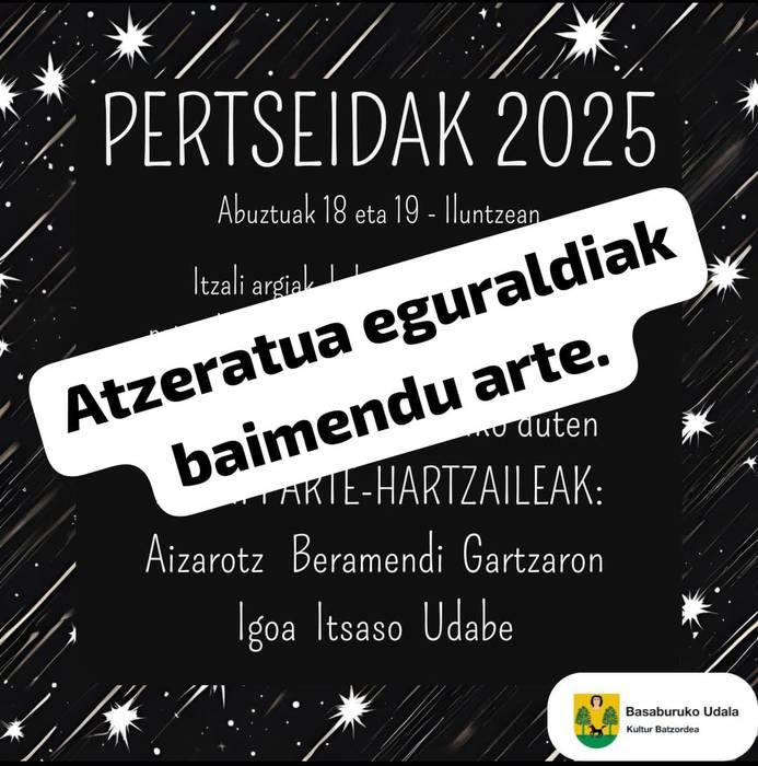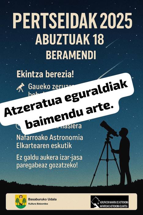 Beramendi eta Udabe izan dira ekimenera batu diren azkeneko bi kontzejuak. Aizarotzen, Gartzaronen, Igoan eta Itsason ere Udalak bigarren urtez proposatutako ideiara batu baitira eta argiteria publikoa itzaltzeko konpromisoa hartua zuten herritarrek ozar-izarrak ongi ikusteko aukera izan zezaten. Abuztuaren 18an eta 19an, gaur eta bihar, izan behar zuen, baina hodeiek ez dutenez ezer ikusten utziko, ekimena atzeratzea erabaki dute. Data berria jakin bezain pronto zabalduko dugu.