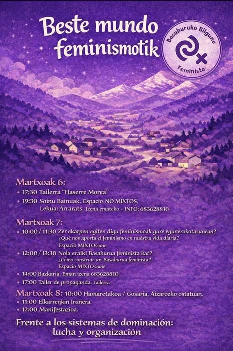 Martxoaren 6an, ostiralarekin, arratsaldean abiatuko da Basaburuko Bilgune Feministak antolatutako egitaraua, 17:30ean "Haserre Morea" tailerrarekin. Ondoren, Arraratsen Soinu Bainuak eginen dituzte. Azken honetan izena eman behar da 683 628 810 telefonoan. Ostiralean, gainera, Basaburuko Udaleko Berdintasun Batzordeak urteroko emakumeen afaria antolatu du, 21:00etan, Igoan. Izena martxoaren 1a baino lehen eman behar da 649 04 27 90 edo 629 27 57 26 telefonoei idatziz.