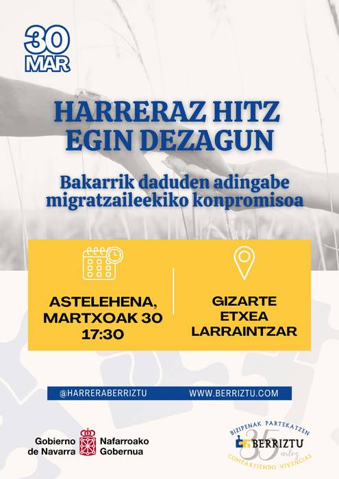 Nafarroa osoan jarri nahi den programa bat da bakarrik etortzen diren adingabe migratzaileei harrera egiteko. Horretarako, harrera pertsonak eta familiak bilatzen ari dira. Modu ezberdinetan parte hartu daiteke, etxean aste osoan, baina baita asteburuetan jai egun eta oporretarako, adibidez. Hau guztia azaltzeko, hitzaldia eskainiko dute astelehenarekin, martxoaren 30ean, 17:30ean Larraintzarren.